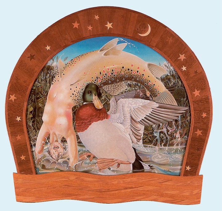 In 1985, Kit Williams designed the Wishing Fish Clock, a centrepiece of the Regent Arcade shopping centre in Cheltenham, Gloucestershire, England. Over 45 feet tall, the clock features a duck that lays a never-ending stream of golden eggs and includes a family of mice that are continually trying to evade a snake sitting on top of the clock. Hanging from the base of the clock is a large wooden fish that blows bubbles every half hour. Catching one of these bubbles entitles you to make a wish, hence the name of the clock.