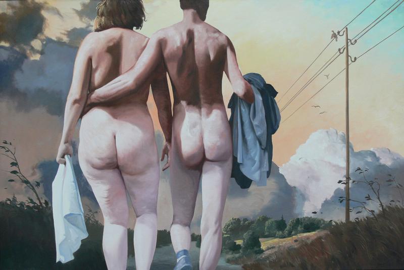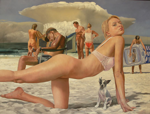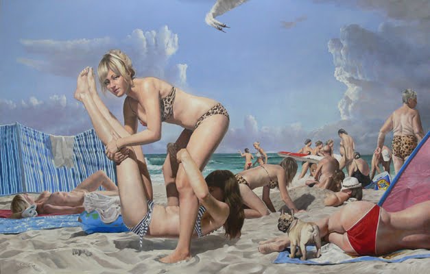 From Botticelli's "Birth of Venus", Giorgiones "Venus in a landscape", Tizians Venus in bourgeois interior via nudes by Rembrandt, Manet, Renoir, Modigliani, Matisse, up to Cézanne or Corinth - Rolf Ohst cites them all. Doing that, he overreaches the baroque plentitude to the extreme. He paints Botticelli's Venus in gracefully trembling shy corpulence and placing his figures in maritime landscapes with dramaticly clouded skies which let the famous dutch masterpieces come to life alltough the figures are kept characteristic of classic modern. When he names his resting, fat beauty reminiscent of a stranded whale gasping for breath, after Edward Munch's famous "The Scream" the sampling becomes perfect. Rolf Ohst manages to tie in with best traditions of nude-painting in a disrespectful humorous way and to convert them into the presence.